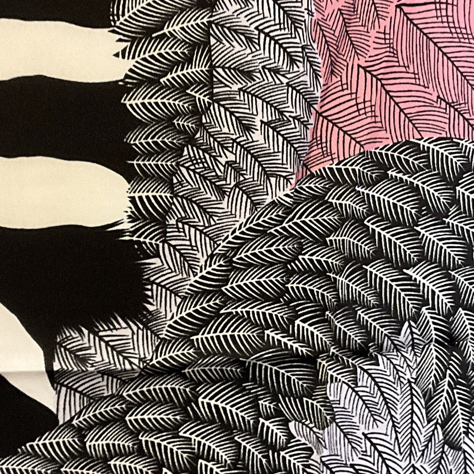 In the fashionable style of Hermes, this 90cm 35" Square scarf. Brand new with tags. Black, white, and pink. Dress it up or down. This is NOT a Hermes scarf